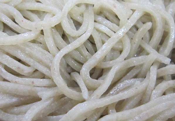 丸抜きからの粗挽きのため、あくまで上品で不純物が入らず純粋なそばの味が味わえます。色調は白め、ざらついた食感と、モチ感、甘み・風味の強さが特徴です。